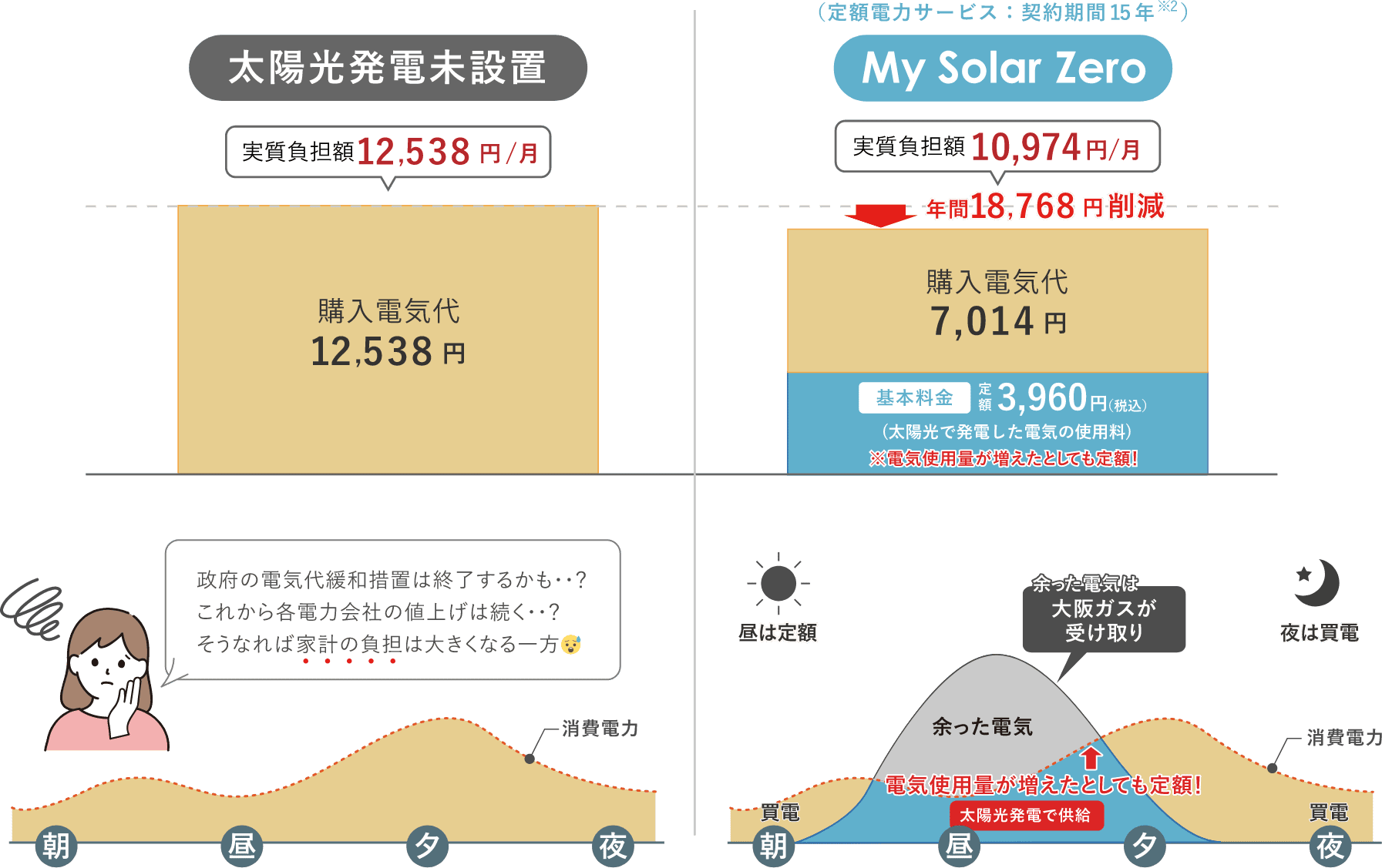 試算条件:[地域]名古屋市、家族構成4人、電気ガス併用[電力契約条件]中部電力、従量電灯プランB、契約電流50A/太陽光発電 5.34kWシステム、年間発電量6,408kWh、年間電力使用量4,440kWh(370kWh/月)、自家消費量 170kWh/月、発電量に対する自家消費率32.0%、再生可能エネルギー発電促進賦課金3.98円/kWh(2025年5月~2026年4月単価)、燃料調整費+0.79円/kWh(2026年1月度単価)価格はすべて税込み表記です。※2026年1月現在の情報です。 ※数値は一定条件の弊社シミュレーションであり、生活パターンにより、電気の使用量が異なるため、保証するものではありません。