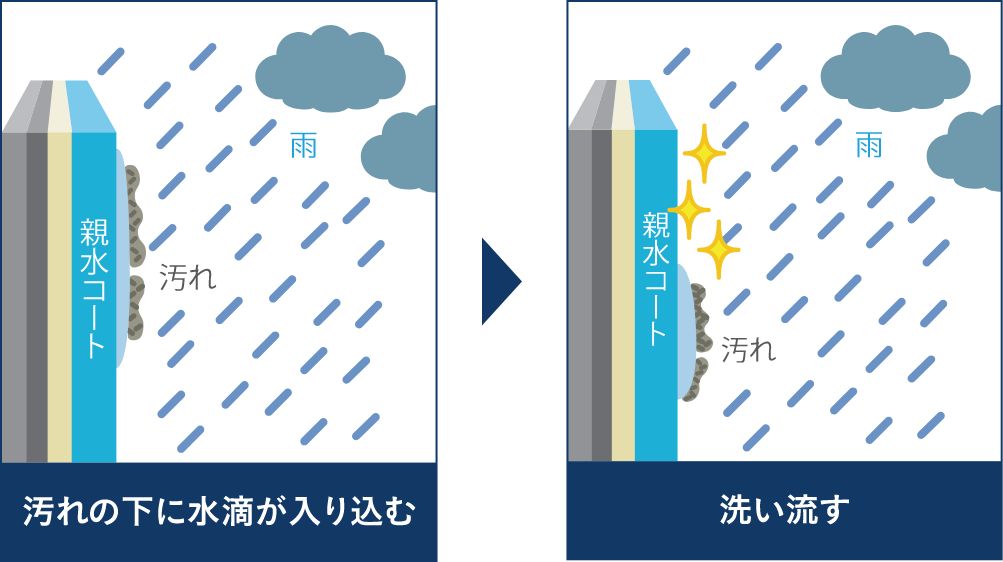 - 雨などの水が汚れの下に入り込み浮き上がらせることによって、汚れが流れ落ちる親水コーティングの商品を採用。