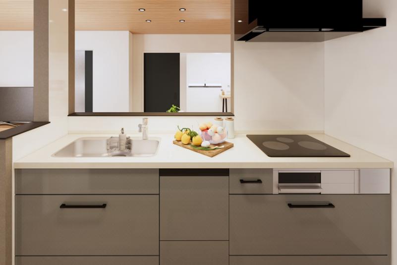 底面は傷が目立ちにくく、奥行きワイドなステンレスシンク。小物置き付きでシンク周りの小物をすっきり収納できます。ストック類や普段使わないものを分類できる機能的な収納のキャビネットはソフトクローズレール仕様で静かにピタッと閉まる、安全な引き出し。