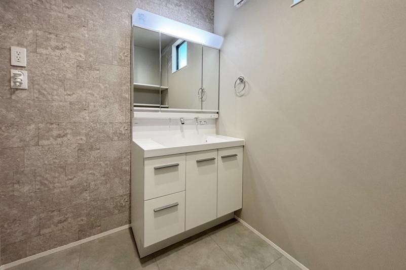 毎日使うハブラシなどの衛生用品や化粧品など、細かなものをそれらのきちんと収納できるミラーキャビネットはLEDライトでお顔映りもバッチリ。またキレイアップ水栓は、水栓が上部にあるので周りに水がたまりにくく、水滴を拭き取るだけで簡単キレイ。