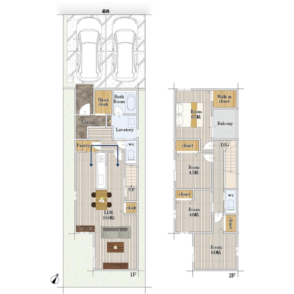広々とした19.0帖のLDK。玄関からもキッチンからも出入りできる2WAYパントリー完備。動線もコンパクトで便利♪大型のシューズクローゼットには家族の靴はもちろんベビーカーや趣味用品も収納可能!リビングスルー階段で家族のコミュニケーションもアップ!リビングのカウンターはお子様の学習スペースとして活躍しそう。