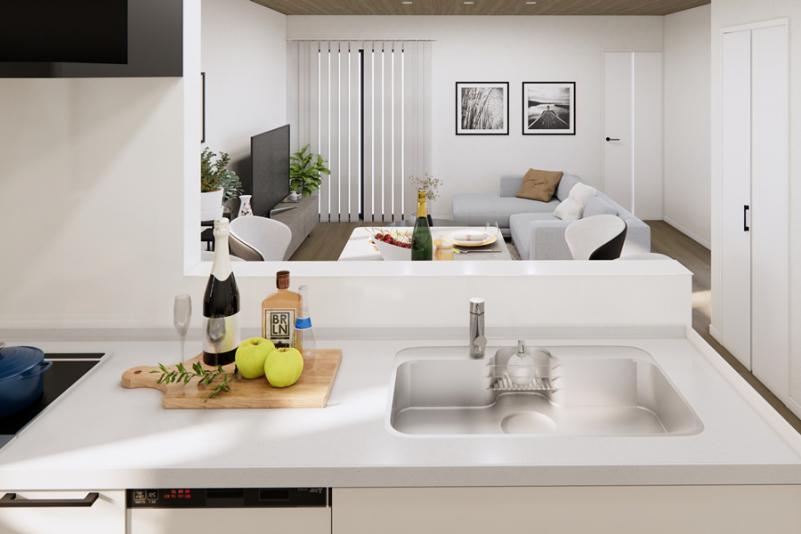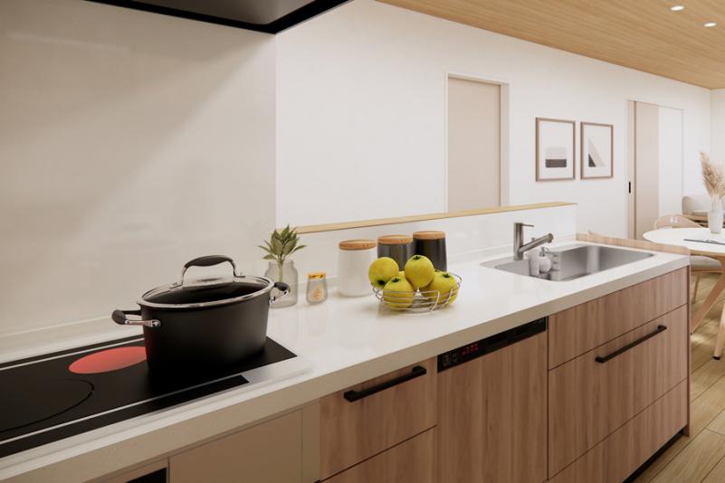 底面は傷が目立ちにくく、奥行きワイドなステンレスシンク。小物置き付きでシンク周りの小物をすっきり収納できます。ストック類や普段使わないものを分類できる機能的な収納のキャビネットはソフトクローズレール仕様で静かにピタッと閉まる、安全な引き出し。