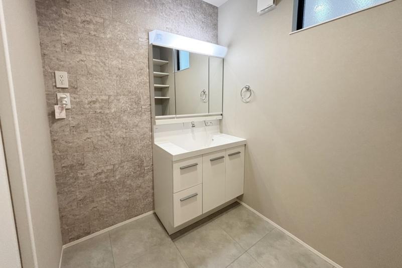 毎日使うハブラシなどの衛生用品や化粧品など、細かなものをそれらのきちんと収納できるミラーキャビネットはLEDライトでお顔映りもバッチリ。またキレイアップ水栓は、水栓が上部にあるので周りに水がたまりにくく、水滴を拭き取るだけで簡単キレイ。