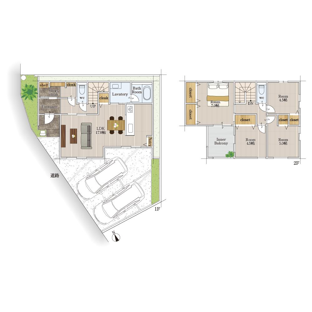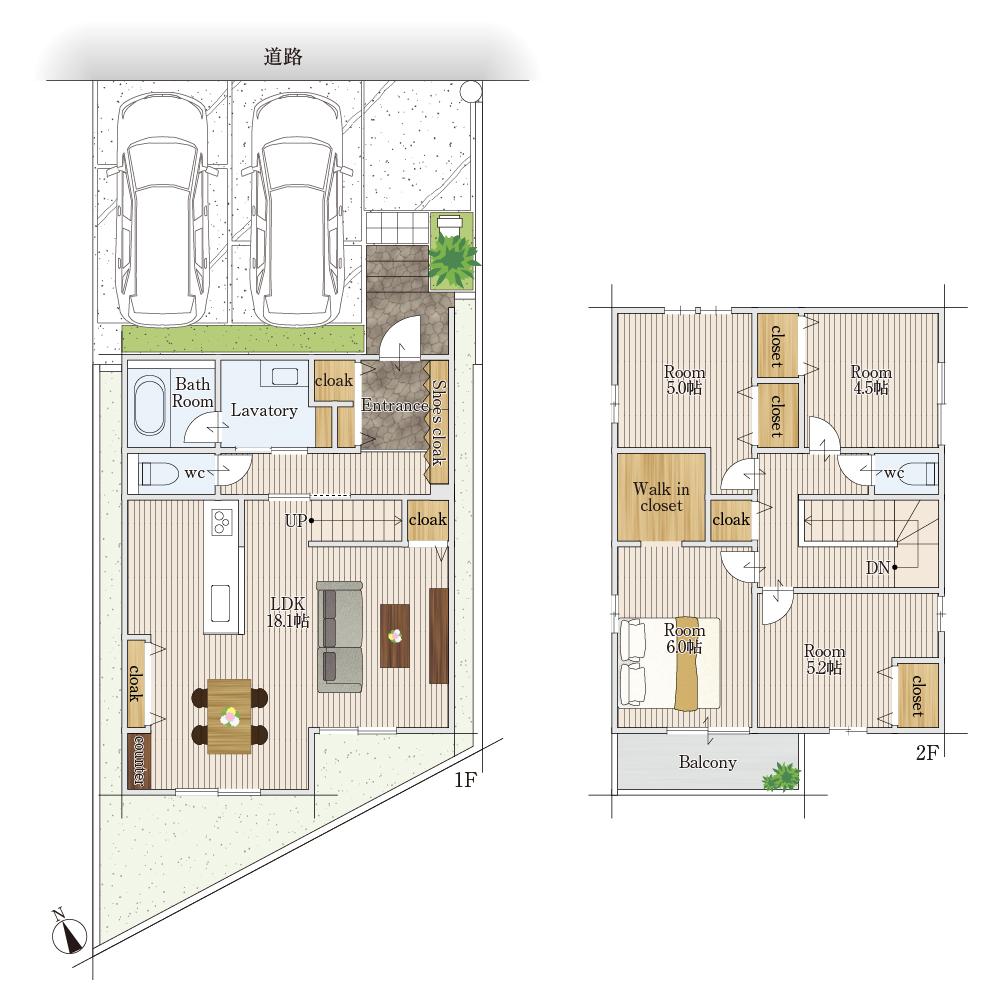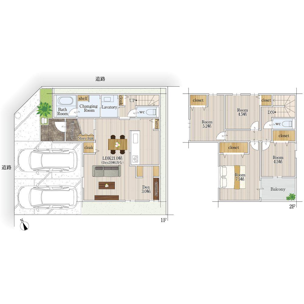 2WAYシューズクロークを備えた間取りは、家族用と来客用で玄関を分けられる設計となっており、生活感を上手に隠しながらスッキリとした玄関空間を実現できます。