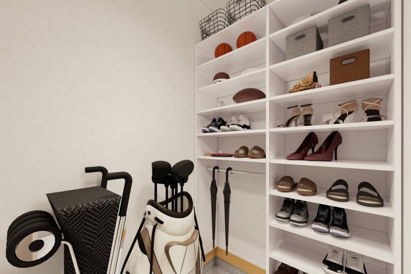 シューズクロークの内部には稼働棚とクロークを設けているため、靴だけでなくベビーカーやゴルフバッグなどの大型の荷物も無理なく収納可能。