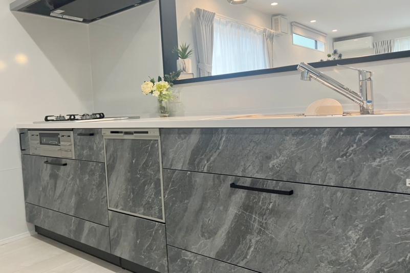 水栓まわりに水がたまらない「キレイアップ水栓」と、つなぎ目のない「キレイアップカウンター」でお掃除が簡単です 。手をかざすだけで水が出るタッチレス水栓も選べます 。効率よく収納できる大容量キャビネットも魅力です 。
