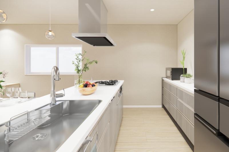 底面は傷が目立ちにくく、奥行きワイドなステンレスシンク。小物置き付きでシンク周りの小物をすっきり収納できます。ストック類や普段使わないものを分類できる機能的な収納のキャビネットはソフトクローズレール仕様で静かにピタッと閉まる、安全な引き出し。