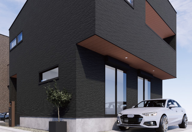 ブラック、ダークグレーの外壁に木目の軒天材を使用し、落ち着いた雰囲気を醸し出します。