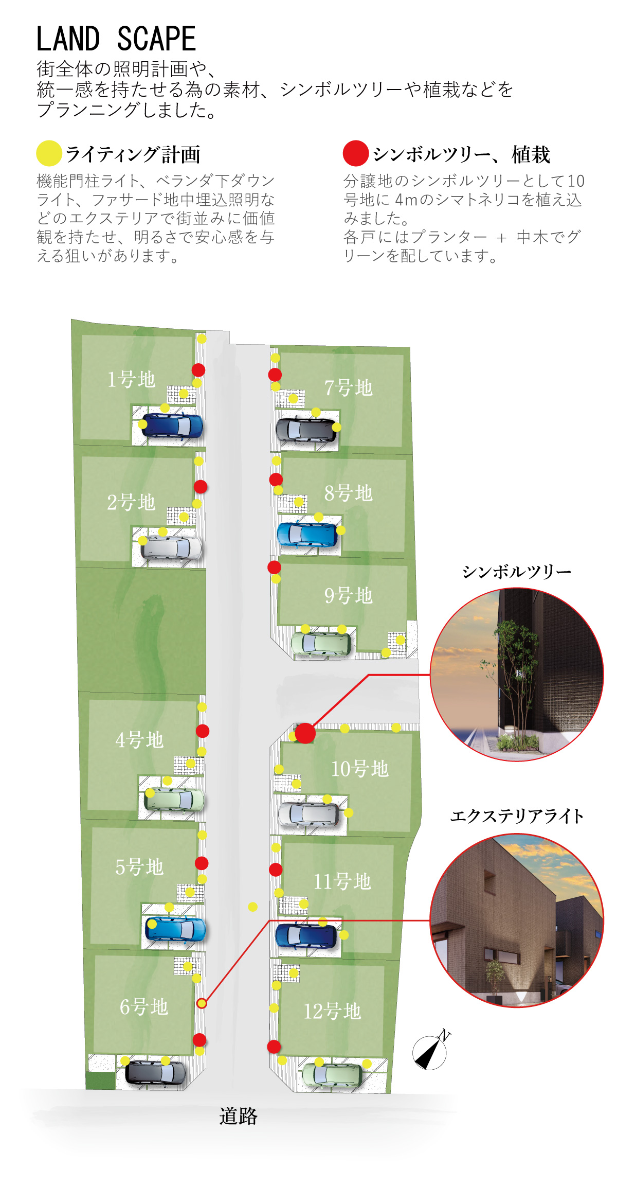 物件の夕景イメージパース。それぞれのライトアップが、物件全体の明るさ、安心感へ繋がる。